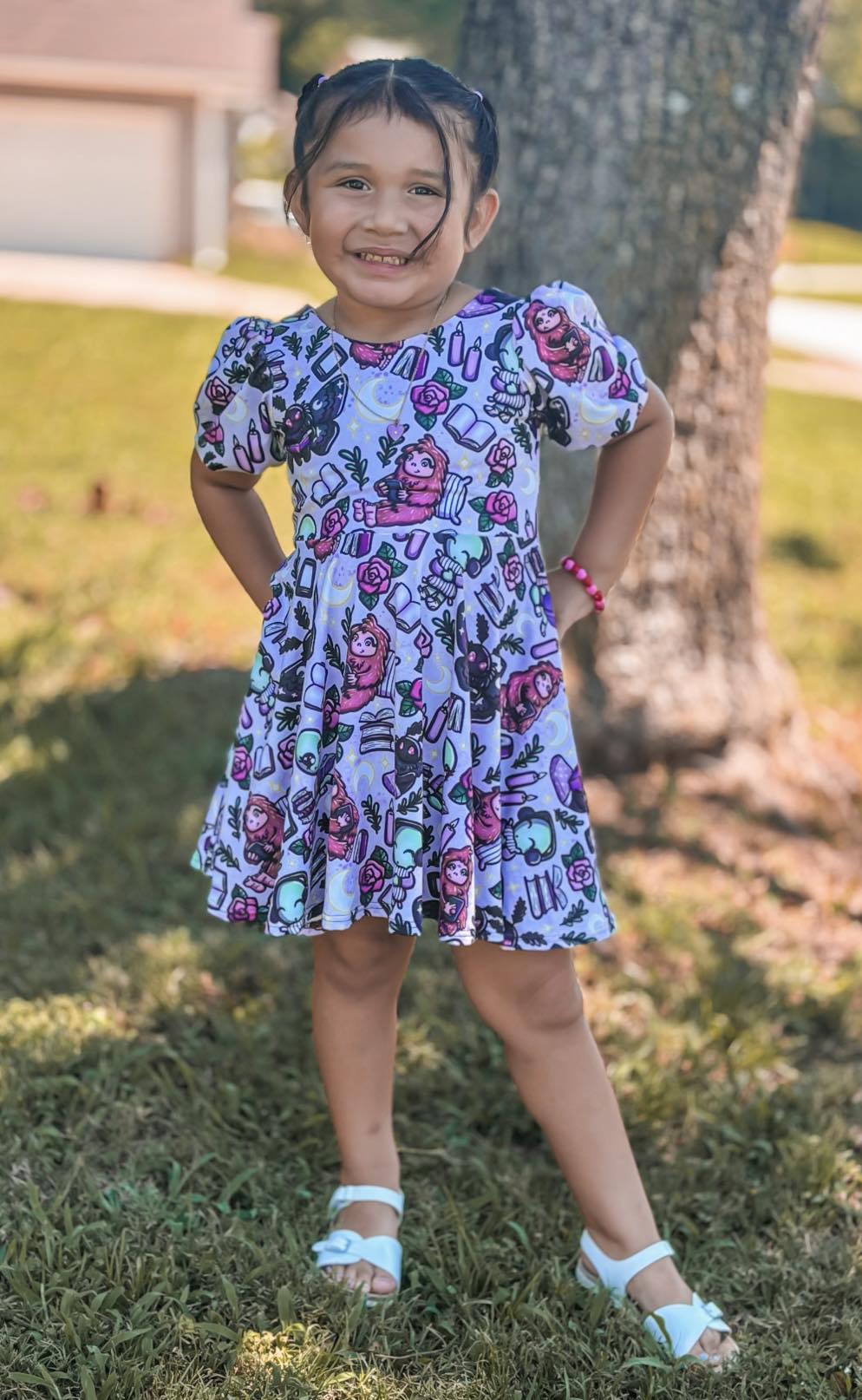 Short puff sleeves, circle twirl skirt.